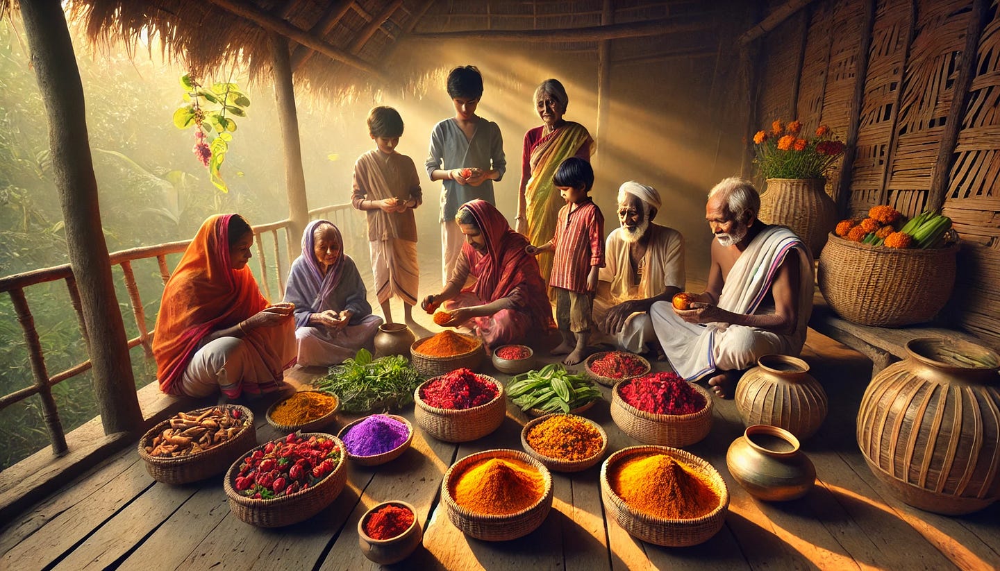 When Holi morning finally arrived, Avi woke even before sunrise, his anticipation quietly urging him toward the Hall. He found elders already assembling beneath the spacious veranda, bringing with them baskets of turmeric roots, deep-red hibiscus petals, bright-orange marigolds, freshly dug beetroots, spinach leaves, and crisp coriander. They worked together with determination and genuine merriment. Avi watched closely as hands rhythmically ground turmeric on smooth stone, releasing an earthy, peppery fragrance that gently filled the morning air. Beside him, hibiscus petals, velvety and deep red, were pressed gently by careful fingers, their juice staining hands crimson, scenting the air faintly sweet. Marigolds dropped quietly into earthen bowls, and soon the soft laughter of women mingled gently with the aromatic freshness of crushed greens.