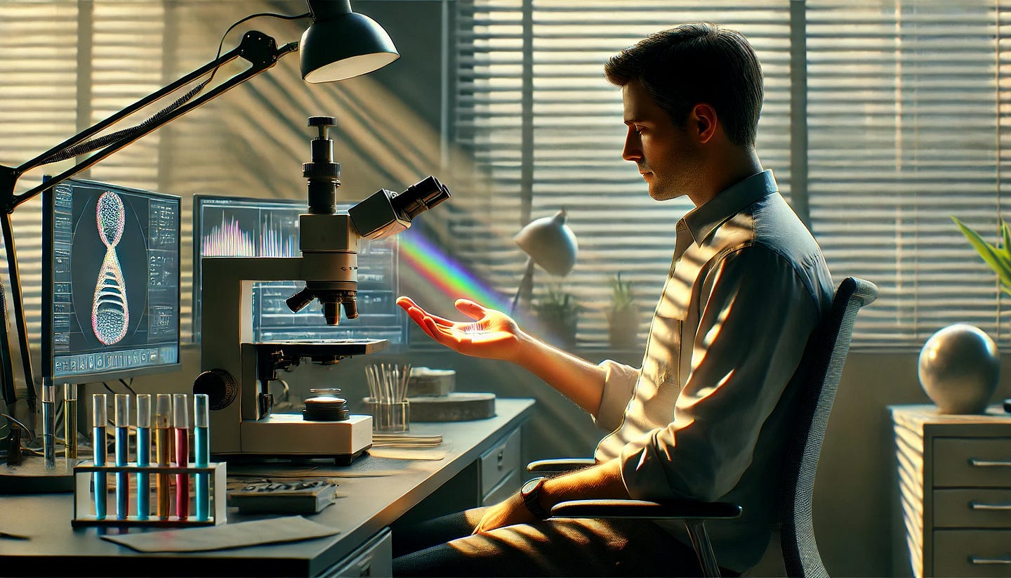 One afternoon, months into this work, Avi sat quietly at his desk, leaning back from another careful review of his latest findings. His gaze drifted thoughtfully toward the window, the late afternoon sunlight once again streaming softly through the laboratory blinds. Unconsciously, he stretched out his hand, allowing the gentle lines of refracted rainbow to rest upon his skin.
